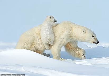 Um prêmio digno de fotografia, Isabel capturou cenas de uma família do que parecem ser trigêmeos - o que é algo raro, já que a maioria das ninhadas de ursos polares normalmente apresenta um ou dois filhotes.