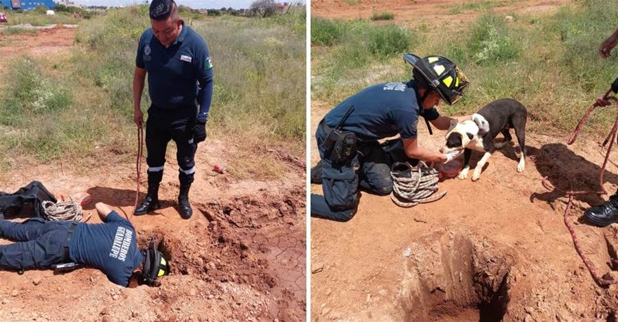 Os Bombeiros Guadalupe, em Zacatecas, México, atenderam ao chamado de um vizinho e salvaram este canino que permaneceu neste buraco de 4 metros de profundidade.