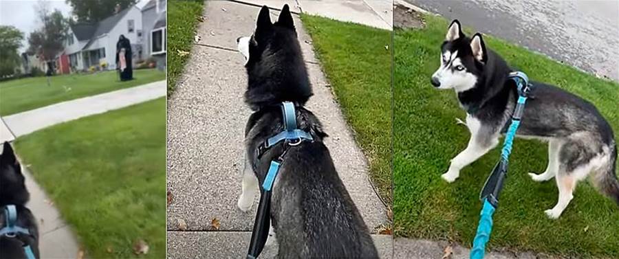 No vídeo que mostra tamanho pavor, o peludinho estava caminhando com a sua tutora pelo bairro, quando viu no jardim de uma casa um boneco: o Ceifador.